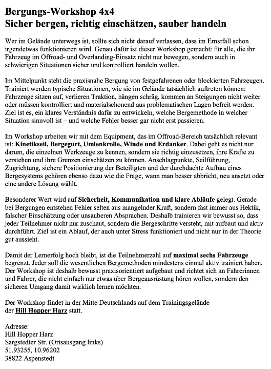 - Ich führe Workshops für Bergung von Fahrzeugen und Umgang mit Bergematerial und Winde für die Veranstalter durch